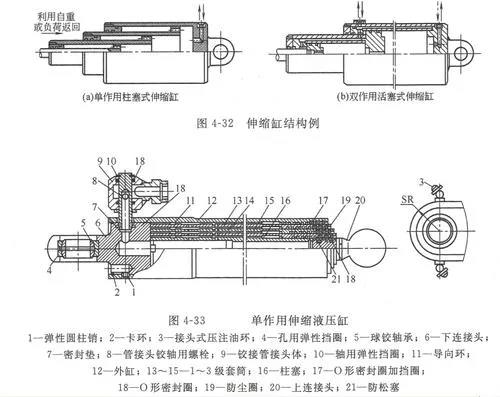伸縮式液壓缸具有二級或多級活塞,伸縮式液壓缸中活塞伸出的順序式從大到小,而空載縮回的順序則一般是從小到大。伸縮缸可實現(xiàn)較長的行程,而縮回時長度較短,結(jié)構(gòu)較為緊湊。此種液壓缸常用于工程機械和農(nóng)業(yè)機械上。有多個一次運動的活塞,各活塞逐次運動時,其輸出速度和輸出力均是變化的。